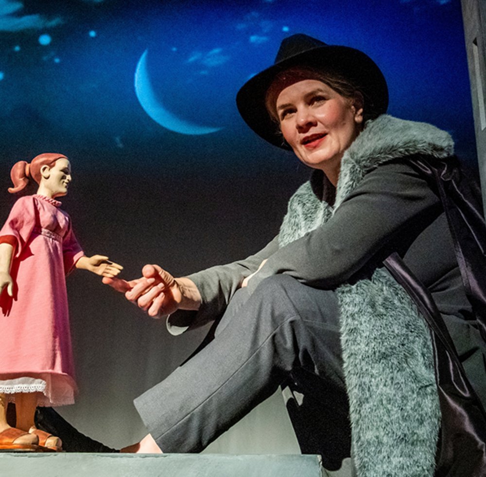 In einer Verbindung von Puppen- und Schauspiel entwickelt Sabine Schramm auf der Bühne fünf Figuren. Eine One–Woman-Show für eine Puppenspielerin, drei stilisierte graue Stühle, fünf große Klappmaulpuppen und eine Handvoll lauter Popsongs!