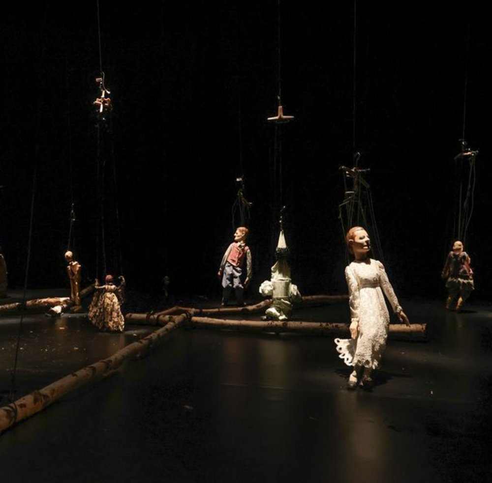 Fünf Puppenspieler zeigen das auf der Bühne.